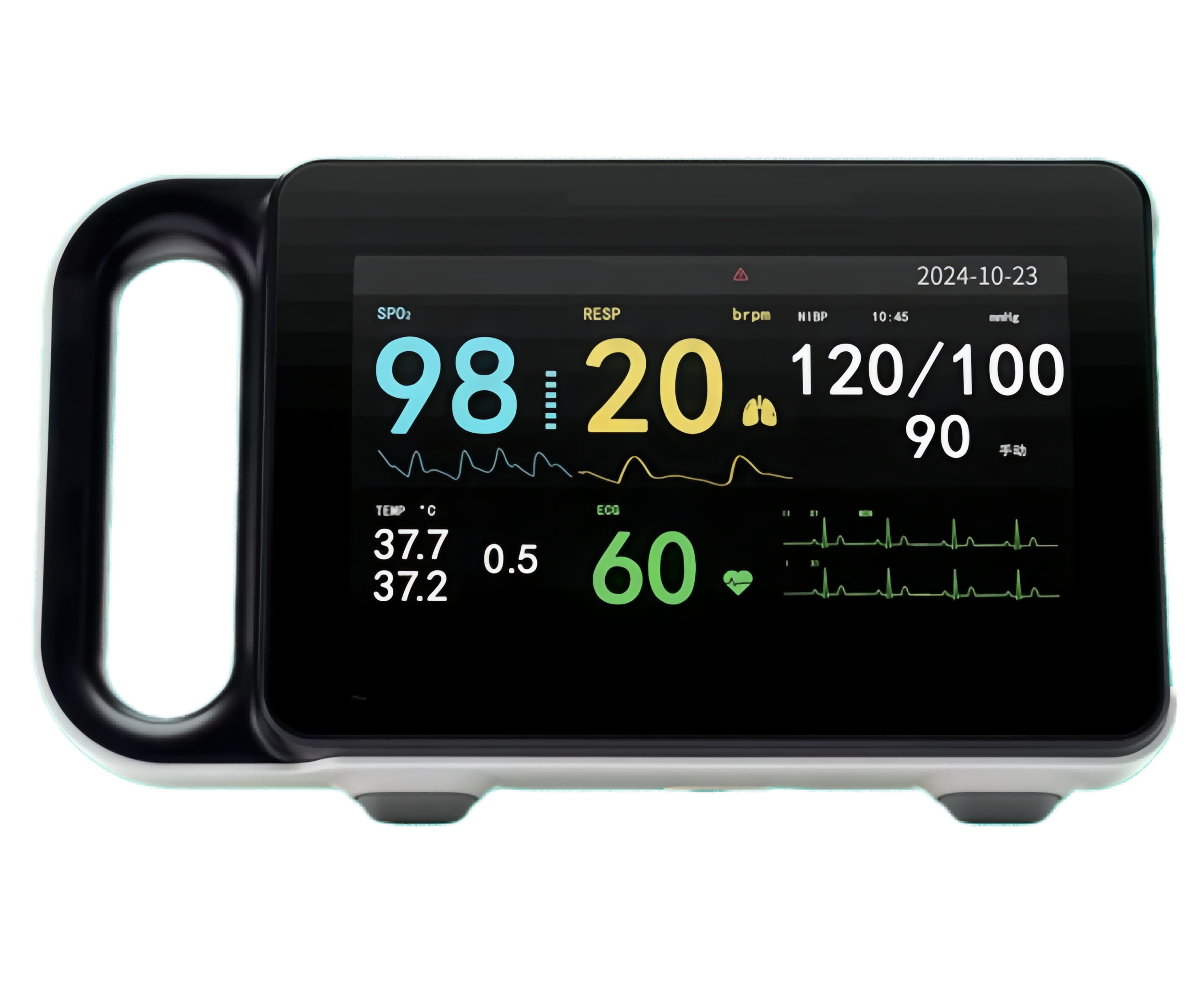 Monitors SpO2 (70-100% ±2%), PR (30-255bpm ±3bpm), NIBP (systolic 40-270mmHg, diastolic 10-210mmHg).