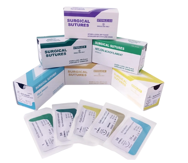 Includes both absorbable (PGA, PDO, Catgut) and non-absorbable (Polypropylene, Polyester, Nylon, Silk) materials in color-coded options.